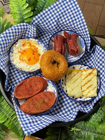Izgara sucuk,ızgara hellim,soslu sosis,pişi ,1 adet göz yumurta ve 1 adet çay ile servis edilir.